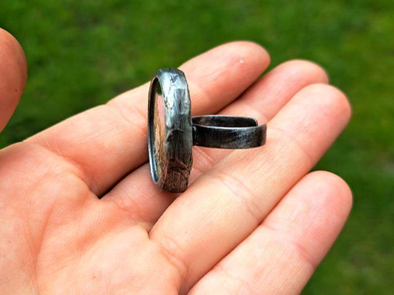 Pierścionek wykonany został metodą witrażową ze szkła, miedzi i ekologicznej cyny. Oprawa stylizowana jest na kolor ciemnego srebra. Obrączka regulowana.