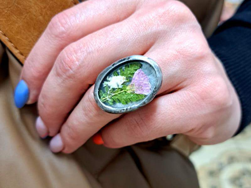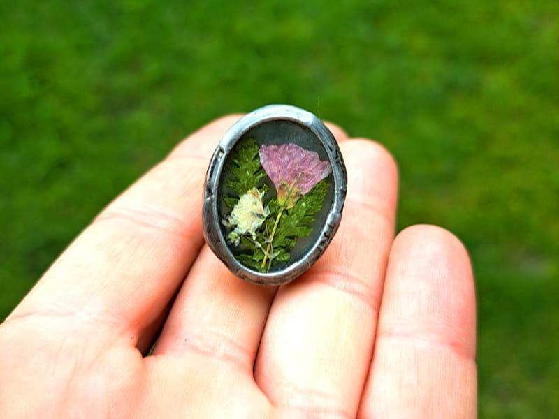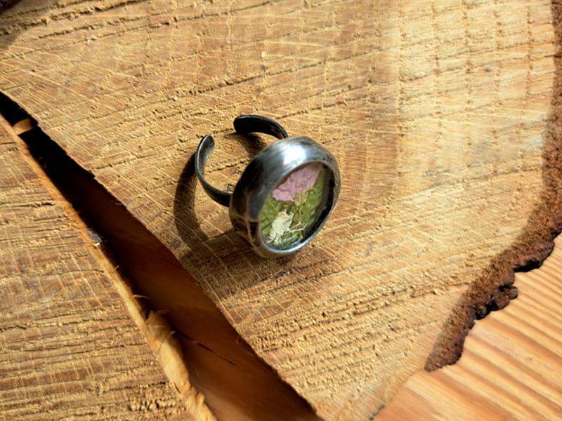 Efektowny, regulowany pierścionek z dzwonkami, paprocią i gipsówką zamkniętymi w owalnym szkle, otulonym rustykalną oprawą. Pierścionek stworzony z myślą o romantyczkach. Jeśli kochasz naturę, będzie dla Ciebie idealnym dodatkiem.